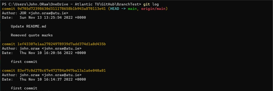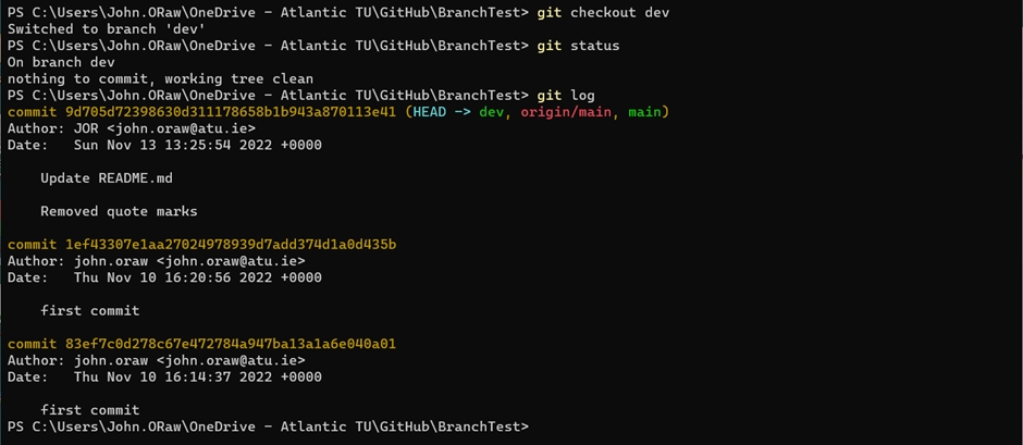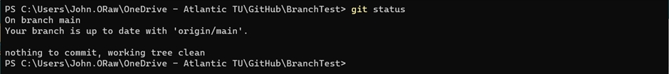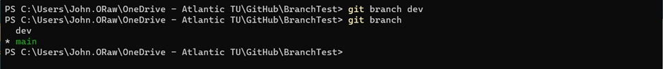 I can create a new branch and then check to see what branches exist. I can see I have two branches, and the * symbol tells me which branch I have currently selected as active.
